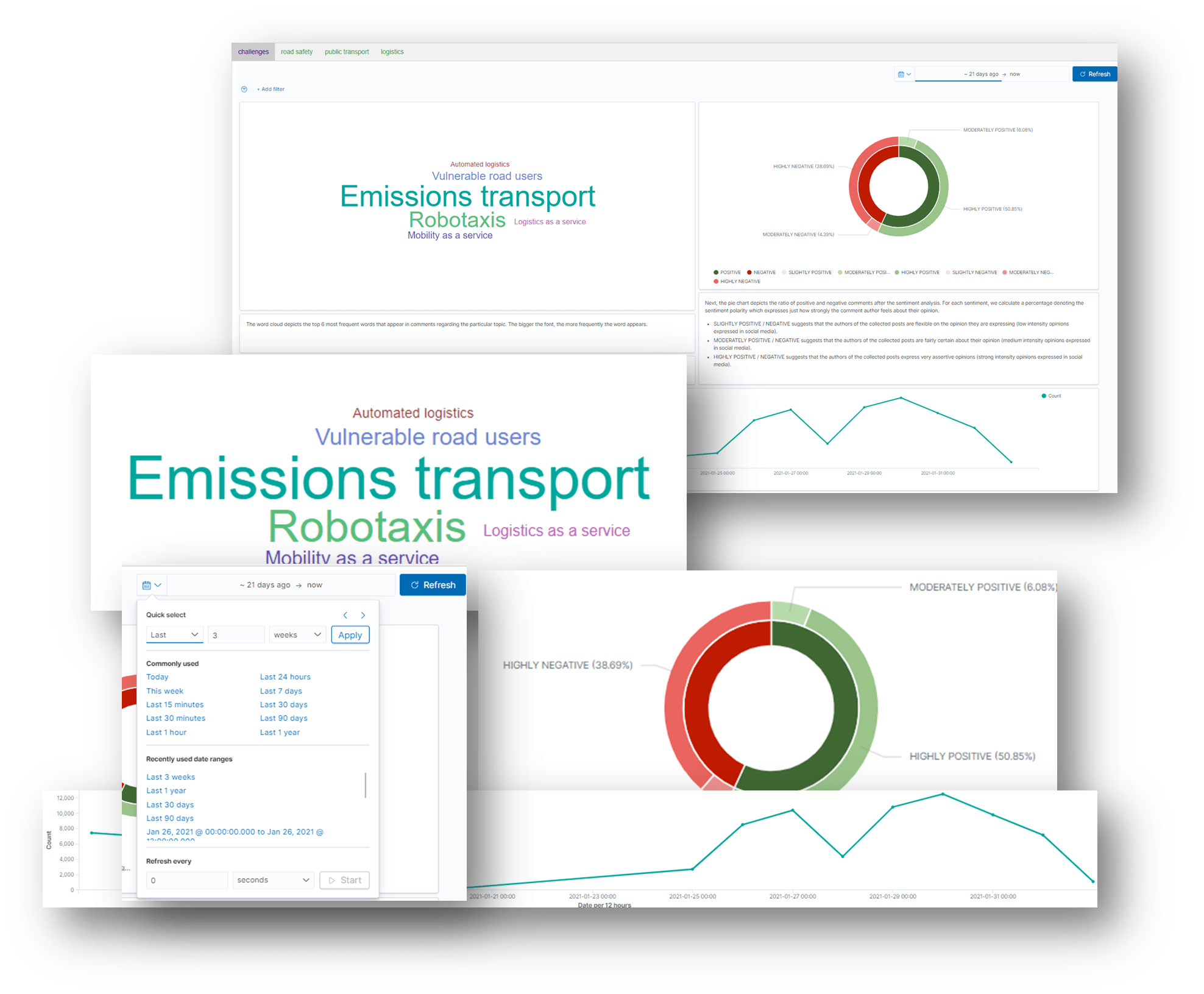 For this to be achieved the SPY tool, deployed by SHOW partner ITML, consists of 4 main subcomponents for data mining, sentiment analysis, data classification and clustering & visualisation. Several technologies have been applied for the data collection and analysis, namely Named Entity Recognition (NER) – for Data mining, Bidirectional Encoder Representations from Transformers model (BERT) – for Sentiment analysis, Latent Dirichlet Allocation (LDA) – for Data classification/clustering and ElasticSearch Kibana toolkit – to provide dashboards with charts, interactive controls, markdown, and more. The results of this Social Media data mining, aggregation and analysis are presented at http://SHOW.itml.gr as a mini dashboard with a set of interactive visualisations per analysed topic (challenges, road safety, public transport and logistics), including a Word Cloud graph that depicts the Top 6 most frequent words that appear on Social Media in the context of AVs, a sentiments’ pie chart that depicts the ratio of the collected positive and negative Social Media posts and a posts timeline chart of collected posts for a given time period. For more information, please contact:  [email protected]