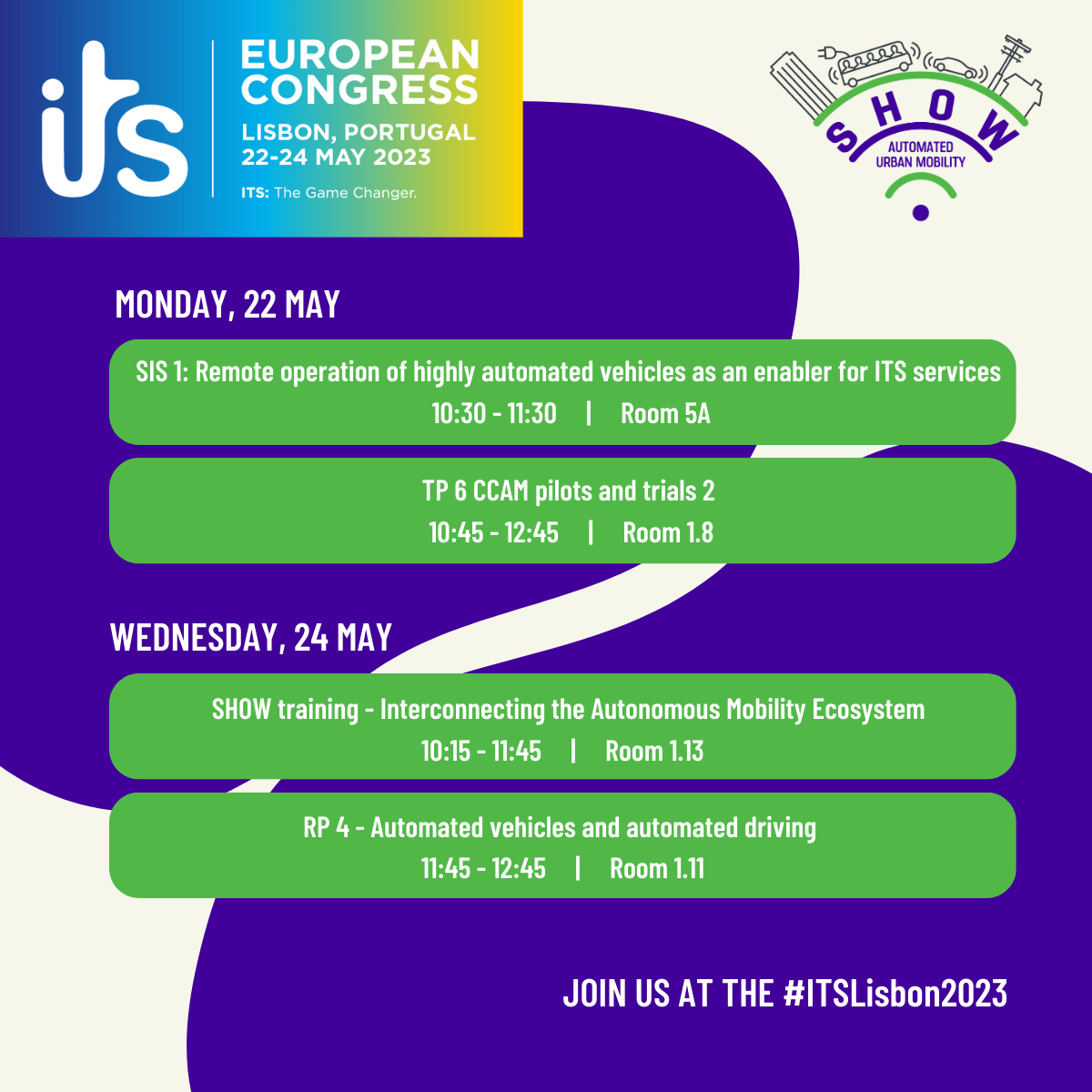 SHOW partners are attending the congress, participating in some of the programme’s sessions to introduce the project’s latest advancements and foster synergies with sister projects. Participants will have the unique opportunity to take the SHOW’s latest course on ‘Interconnecting the Autonomous Mobility Ecosystem’ on-site. You are also welcome to visit the ERTICO stand A14, to discover more about the project.