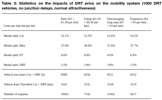 Table 2 indicates the results on modal split and vehicle loss hours and vehicle kilometers driven. The fleet size is varied while the price, delay and attractiveness remain constant. It shows that the more DRT vehicles are available, the larger the modal share of DRT is. Additionally, the share of DRT and car combined increases with larger fleet size, which means that the DRT service mainly takes away the share of public transport (PT) and bike. This is also represented in the vehicle loss hours (shown for car and DRT together) and vehicle kilometers travelled (also shown for car and DRT together). An increased fleet size suggests more vehicle kilometers travelled, more vehicle loss hours and thus more congestion on the roads of the network.